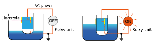 The sensor has a pair of electrodes, and applies alternating current to them. When the liquid covers the electrodes, it forms a part of an electric circuit, causing current to flow. The sensor measures electric resistance of the liquid, and compares the measured value with a preset value to determine liquid presence. When liquid presence is detected, the sensor sends a signal to an amplifier to open or close relay contacts of relay units.