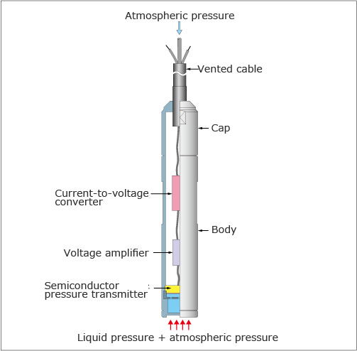 Sensörün ucundaki diyafram, sıvı seviyesine orantılı olarak değişen sıvı basıncı alır. Birleştirilmiş yarı iletken basınç ileticisi sürekli olarak sıvı basıncı elektrik sinyallerine dönüştürerek sürekli olarak bir sıvı seviyesini gösterir. Dahili havalandırmalı kablo ile, atmosfer basıncındaki değişiklik nedeniyle algılama hatası otomatik olarak düzeltilir.