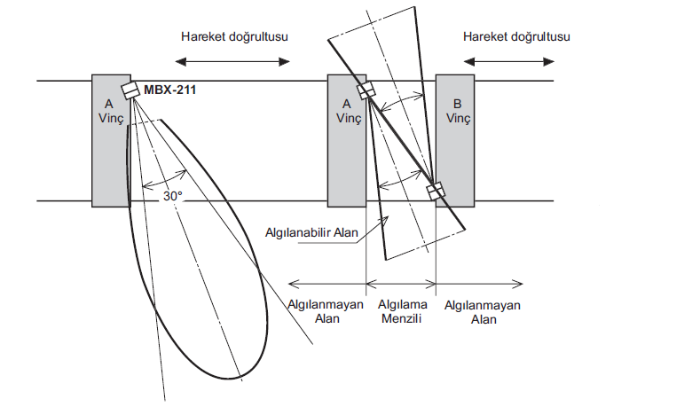 • Cihaz montaj çıkışını ayarlayarak, algılama mesafesinden vinç bağlantı noktasına, devreyi kilitlemeksizin, seri olarak çıkış alınabılır.
