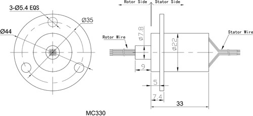 MC330 slip ringler küçük ve kompakt yapıda 22mm dış çaplı 33mm uzunlukta, kapsül tipli, standart, satışa hazır slip ringler olup, basitleştirilmiş elektrik bağlantıları için renk kodlu ana kablolar statorda ve rotorda kullanılır. Her bir iletken için 90° V-kanal iletken tasarımı kullanılır.