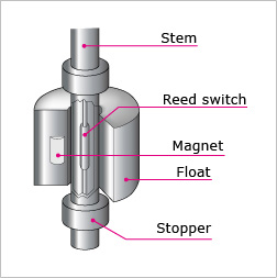 The figure shows the buoy and the stalk. The float integrates a magnet and the body includes a switching switch at the set point. The reed switch opens or closes as the float goes up or down the body.