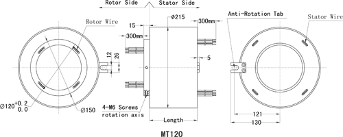 MT120 serisi standart, satışa hazır ürünler olup, basitleştirilmiş elektrik bağlantıları için renk kodlu ana kablolar, statorda ve rotorda kullanılır. Hidrolik veya pnömatik hatların yönlendirilmesi, hidrolik veya pnömatik döner şaft kurulumu için 120mm(4.73") iç çap ve kompakt 215mm dış çap sağlanmıştır. Uzun ömürlü ve birçok zorlu uygulamada en üst düzey performans için fiber fırça kontak teknolojisine sahiptir.