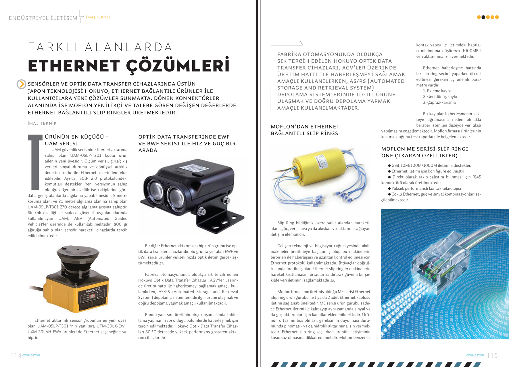 | Türünün En Küçüğü - UAM Serisi UAM güvenlik serisinin Ethernet aktarıma sahip olan UAM-05LP-T301 kodlu ürün ailenin yeni üyesidir. Ölçüm verisi, giriş/çıkış verileri sinyal durumu ve dönüşsel artıklık denetim kodu ile Ethernet üzerinden elde edilebilir. Ayrıca, SCIP 2.0 protokolündeki komutları destekler. Yeni versiyonun sahip olduğu diğer bir özellik ise rakiplerine göre daha geniş alanlarda algılama yapabilmesidir. 5 metre koruma alanı ve 20 metre algılama alanına sahip olan UAM-05LP-T301 270 derece algılama açısına sahiptir. Bir çok özelliği ile sadece güvenlik uygulamalarında kullanılmayan UAM, AGV (Automated Guided Vehicle)'ler üzerinde de kullanılabilmektedir. 800 gr ağırlığa sahip olan sensör hareketli cihazlarda tercih edilebilmektedir. Ethernet aktarımlı sensör grubunun en yeni üyesi olan UAM-05LP-T301 ‘nin yanı sıra UTM-30LX-EW , UXM-30LAH-EWA ürünleri de Ethernet seçeneğine sahiptir. | | Optik Data Transferinde EWF ve BWF Serisi ile Hız ve Güç Bir Arada Bir diğer Ethernet aktarıma sahip ürün grubu ise optik data transfer cihazlarıdır. Bu grupta yer alan EWF ve BWF serisi ürünler yüksek hızda optik iletim gerçekleştirmektedirler. Fabrika otomasyonunda oldukça sık tercih edilen Hokuyo Optik Data Transfer Cihazları, AGV ‘ler üzerinde üretim hattı ile haberleşmeyi sağlamak amaçlı kullanılırken, AS/RS (Automated Storage and Retrieval System) depolama sistemlerinde ilgili ürüne ulaşmak ve doğru depolama yapmak amaçlı kullanılmaktadır. Bunun yanı sıra üretimin birçok aşamasında kablolama yapmanın zor olduğu bölümlerde haberleşmek için tercih edilmektedir. Hokuyo Optik Data Transfer Cihazları 50 °C derecede yüksek performans gösteren aktarım cihazlarıdır. |