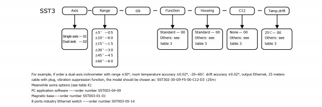 ②The cross-axis sensitivity means the angle that the tilt sensor may be banked to the normal tilt direction of sensor. The cross-axis sensitivity (± 0.1%FS)shows how much perpendicular acceleration or inclination is coupled to the inclinometer output signal. For example, for the single-axis inclinometer withrange ±30°(assuming the X-axis as measured tilt direction), when there is a 10° tilt angle perpendicular to the X-axis direction(the actual measuring angle is no change, example as +8.505°), the output signal will generate additional error for this 10° tilt angle, this error is called as cross-axis sensitivity error.SST300`s cross-axis sensitivity is 0.1%FS, the extra error is 0.1%×30°=0.03°(max), then real output angle should be +(8.505°±0.03°). In SST300 series,this error has been combined into the absolute accuracy