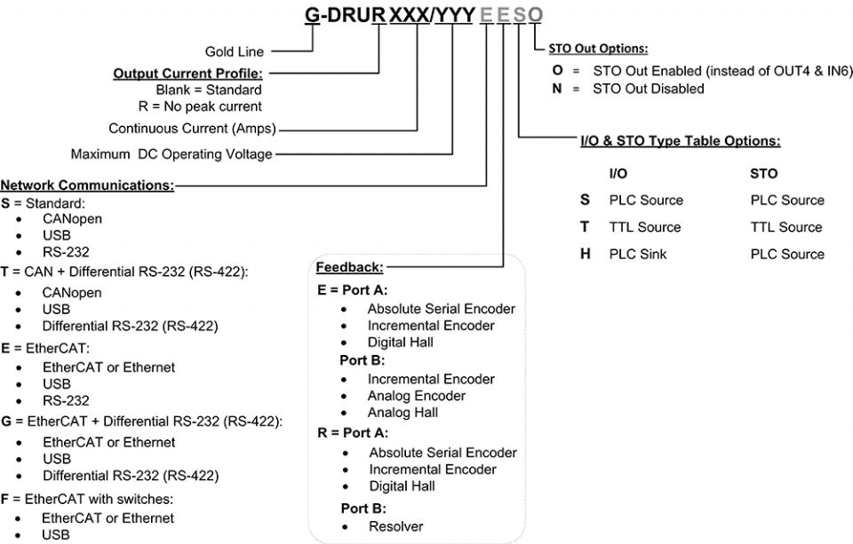 - Multiple communication options: EtherCAT (or EtherCAT with switches), CANopen, RS-232, RS-422 USB, Ethernet