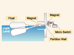 Şamandıranın ucuna monte edilen mıknatıs, sıvı yüzeyinin yükselişini ve düşüşünü, bölme duvarı tarafından tamamen izole edilmiş terminal kutusundaki mıknatısın karşılıklı manyetik kuvveti vasıtasıyla mikro anahtarın AÇIK / KAPALI konuma getirilmesi olarak algılar.