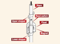 Şamandıranın içine bir mıknatıs yerleştirilmiştir ve gövdeye bir okuma anahtarı yerleştirilmiştir. Şamandıranın içine yerleştirilen mıknatıs, sıvı seviyesinin yükselmesine ve düşmesine bağlı olarak okuma düğmesini AÇIK / KAPALI konuma getirir. Şamandıranın üstündeki ve altındaki durdurucular, temas operasyonlarının kendi kendine bakımı amacıyla şamandıranın hareket alanını sınırlar.