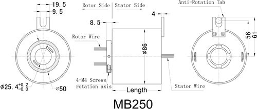 MB250 slip ringler, 25.4mm(1") iç çaplı, 86mm dış çaplı olup, özel slip ring çözümleridir, gücü, sinyal, Ethernet, USB, Devicenet, Control Net, Canbus ile talep üzerine kombine edebilir! Şaft veya opsiyonel flanş montajı işle bağlanabilir.