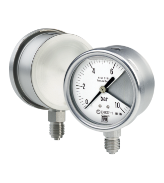 The safety construction consists of a solid separating wall in stainless steel, placed between the scale and the elastic element and a blow out back which is released from the case whenever an internal pressure, due to leaks, is created or the elastic element is broken. A leak tight fit is ensured if the instrument is filled with a dampening fluid to prevent damage due to vibration. These instruments are designed for use in chemical and petrochemical processing industries, and in conventional power plants. They are built to resist the most severe operating conditions created by the ambient environment and the process medium.