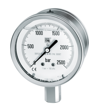 In case of leaks or break of the elastic element, the operator is protected by a solid separating wall placed on the front of the instrument and by the blow out back. They are mainly used on high pressure water jet technology like water cutting machines, hydro blasting pumps and turbines, hydrodemolition. The TIG welding between the case and the process socket, strengthens the instrument and assures a better tight in case of dampening fluid. The advantages of filling the case of the instrument with a dampening fluid are: reduced pointer fluctuation, reduced wear of rotating parts of the movement when pulsant vibrations and pulsations occur.