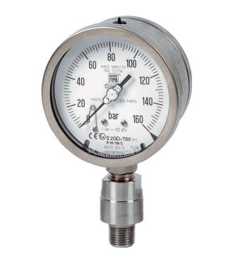 These instruments are built in conformity with the construction and safety specifications of EN 837-1/S3 e ASME B40.1. In case of leaks or break of the elastic element, the operator is protected by a solid separating wall placed on the front of the instrument and by the blow out back. They are usually used in the petrochemical industry; they are built to resist to the most severe conditions created by H2S and by the environment. The TIG welding between the case and the process socket, strengthens the instrument and assures a better tight in case of dampening fluid The advantages of filling the case of the instrument with a dampening fluid are: reduced pointer fluctuation, reduced wear of rotating parts of the movement when pulsant vibrations and pulsations occur. Moreover condensation and corrosive atmospheres which could damage the internal parts.