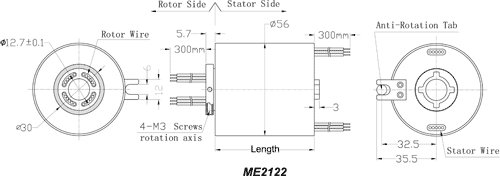 ME2122,support 2 channel 1000M baseT ethernet slip rings, with through bore size 12.7mm(0.5"), overall diameter 56mm, are standard, off-the-shelf, Color-coded lead wires are used on both the stator and rotor for simplified electrical connections.