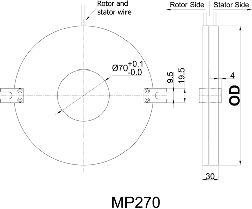 MP270 slip ring'ler, pancake tasarımlı olup, kalınlık 30.00mm, delik ebatı 70.00mm(2.57") olup, standart yapıdadır.