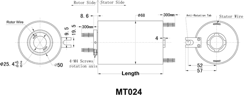 MT024 serisi standart, satışa hazır ürünlerdir, Basitleştirilmiş elektrik bağlantıları için renk kodlu ana kablolar statorda ve rotorda kullanılır. Sinyal (5A) maks. 250VAC/VDC'de iletebilir.