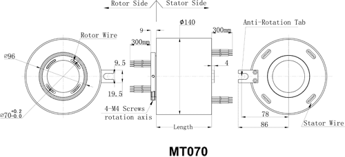 MT070 serisi standart, satışa hazır ürünler olup, basitleştirilmiş elektrik bağlantıları için renk kodlu ana kablolar, statorda ve rotorda kullanılır. Hidrolik veya pnömatik hatların yönlendirilmesi, hidrolik veya pnömatik döner şaft kurulumu için 70mm(2.76") iç çap ve kompakt 140mm dış çap sağlanmıştır. Uzun ömürlü ve birçok zorlu uygulamada en üst düzey performans için fiber fırça kontak teknolojisine sahiptir.