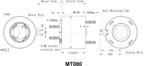 MT080 serisi standart, satışa hazır ürünler olup, basitleştirilmiş elektrik bağlantıları için renk kodlu ana kablolar, statorda ve rotorda kullanılır. Hidrolik veya pnömatik hatların yönlendirilmesi, hidrolik veya pnömatik döner şaft kurulumu için 80mm(3.15") iç çap ve kompakt 158mm dış çap sağlanmıştır. Uzun ömürlü ve birçok zorlu uygulamada en üst düzey performans için fiber fırça kontak teknolojisine sahiptir.