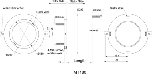 MT180 serisi standart, satışa hazır ürünler olup, basitleştirilmiş elektrik bağlantıları için renk kodlu ana kablolar, statorda ve rotorda kullanılır. Hidrolik veya pnömatik hatların yönlendirilmesi, hidrolik veya pnömatik döner şaft kurulumu için 180mm(7.09") iç çap ve kompakt 292mm dış çap sağlanmıştır. Uzun ömürlü ve birçok zorlu uygulamada en üst düzey performans için fiber fırça kontak teknolojisine sahiptir.
