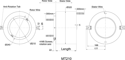 MT210 serisi standart, satışa hazır ürünler olup, basitleştirilmiş elektrik bağlantıları için renk kodlu ana kablolar, statorda ve rotorda kullanılır. Hidrolik veya pnömatik hatların yönlendirilmesi, hidrolik veya pnömatik döner şaft kurulumu için 210mm(8.27") iç çap ve kompakt 320mm dış çap sağlanmıştır. Uzun ömürlü ve birçok zorlu uygulamada en üst düzey performans için fiber fırça kontak teknolojisine sahiptir.