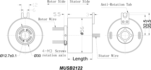 MUSB2122, 2 kanal destekli USB2.0, 12.7mm(0.5") iç çaplı, 56mm dış çaplı, standart, satışa hazır slip ringler,