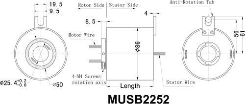 MUSB2252, 2 kanal destekli USB2.0, 25.4mm(1") iç çaplı, 86mm dış çaplı, standart, satışa hazır slip ringler,