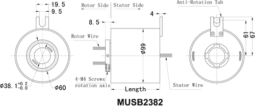 MUSB2382, 2 kanal destekli USB2.0, 38.1mm(1.5") iç çaplı, 99mm dış çaplı, standart, satışa hazır slip ringler,