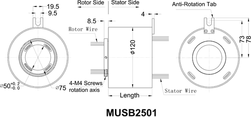 MUSB2501, 1 kanal destekli USB2.0, 50.00mm(1.97") iç çaplı, 120mm dış çaplı, standart, satışa hazır slip ringler,