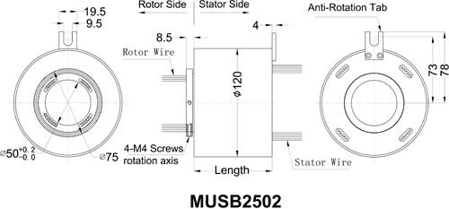 USB2501, 1 kanal destekli USB2.0, 50.00mm(1.97") iç çaplı, 120mm dış çaplı, standart, satışa hazır slip ringler,