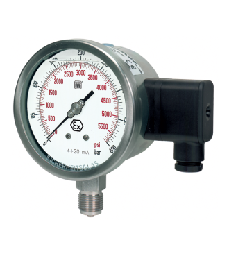 MX, 18, DN100, ✔, as, ATEX, version, with, local, readout, DS, 4", (100mm), Intrinsically, Double, elastic, element:, Bourdon, tube, and, electronic, sensor, safe, EMC, immunity:, pressure, per, EN, 61326, transmitter, Calibration:, adjustable