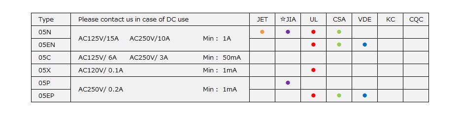 | Resistance between Terminals | 05X・05P・05EP :Less than 10mΩ(Initial value) 05N・05EN・05C :Less than 30mΩ (Initial value) |