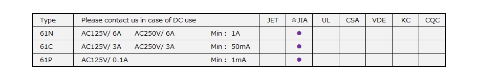 | Resistance between Terminals | 61P :Less than 10mΩ(Initial value) 61N・61C :Less than 30mΩ (Initial value) |