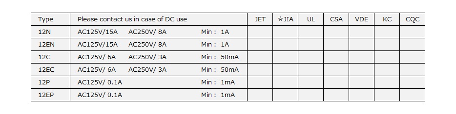 | Resistance between Terminals | 12P・12EP :Less than 10mΩ(Initial value) 12N・12EN・12C・12EC :Less than 30mΩ (Initial value) |
