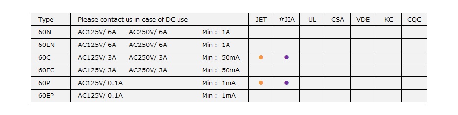 | Resistance between Terminals | 61P・60EP :Less than 10mΩ(Initial value) 61N・60EN・61C・60EC :Less than 30mΩ (Initial value) |