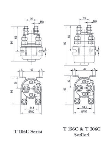 T 106C, T 156C, T206C Değişken Kutuplu DC Kontaktör Teknik Özellikleri