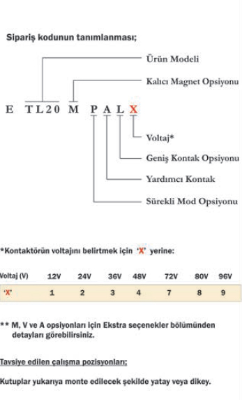 Kalıcı mıknatıs özelliğine sahip TL 10 ve TL 11 kontaktörleri 36VDC üzeri gerilimlerde önerilir.