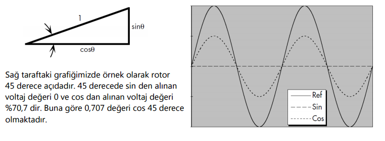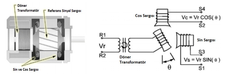 Yukarıdaki şekillerden de takip edileceği gibi mekanik olarak birbirlerine 90 derece açılı sin ve cos bobinlerinden meydana gelmiştir. Sin ve Cos bobinlerinden sinyal alınabilmesi için, döner transformatör Referans voltajını üreterek mükemmel sinüs dalga ile rotorun sıfır noktasına göre açı değerini verir. Aşağıdaki geometrik model ve örnek sinyal grafiği çalışma şeklinin daha iyi anlaşılması için yardımcı olacaktır. Bu sistemde ' sin açısı / cos açısı = tan açısıdır' açı da böylelikle rotor şaft aşısıda eşit olmaktadır. Çünkü sistem mekanik olarak bu geometrik modelde dizayn edilmiştir.