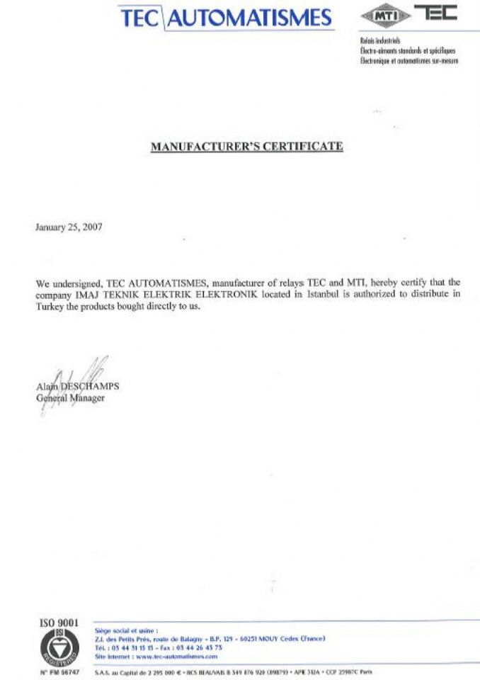 Tec Automatismes geniş ürün yelpazesi ve kişiye özel çözümleri ile enerji , toplu taşıma , güvenlik (erişim kontrolü, asansör ve yangın güvenliği), çevre ve endüstri alanlarında en talepkar müşteriler için kilit bir ortaktır. Tec Automatismes Türkiye distribütörlük anlaşmamız 2018 yılında imzalanmış olupTec Automatismes ürünlerinin teminini ve bilgi aktarımını sağlamaktayız.