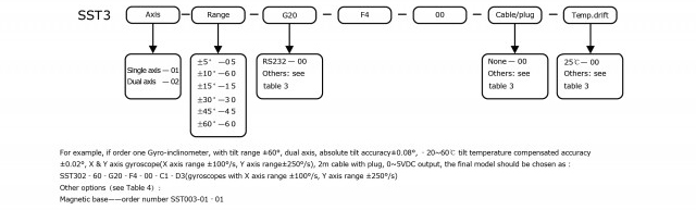 ②The cross-axis sensitivity means the angle that the tilt sensor may be banked to the normal tilt direction of sensor. The cross-axis sensitivity (± 0.1%FS)shows how much perpendicular acceleration or inclination is coupled to the inclinometer output signal. For example, for the single-axis inclinometer withrange ±30°(assuming the X-axis as measured tilt direction), when there is a 10° tilt angle perpendicular to the X-axis direction(the actual measuring angle is no change, example as +8.505°), the output signal will generate additional error for this 10° tilt angle, this error is called as cross-axis sensitivity error.SST300`s cross-axis sensitivity is 0.1%FS, the extra error is 0.1%×30°=0.03°(max), then real output angle should be +(8.505°±0.03°). In SST300 series,this error has been combined into the absolute accuracy